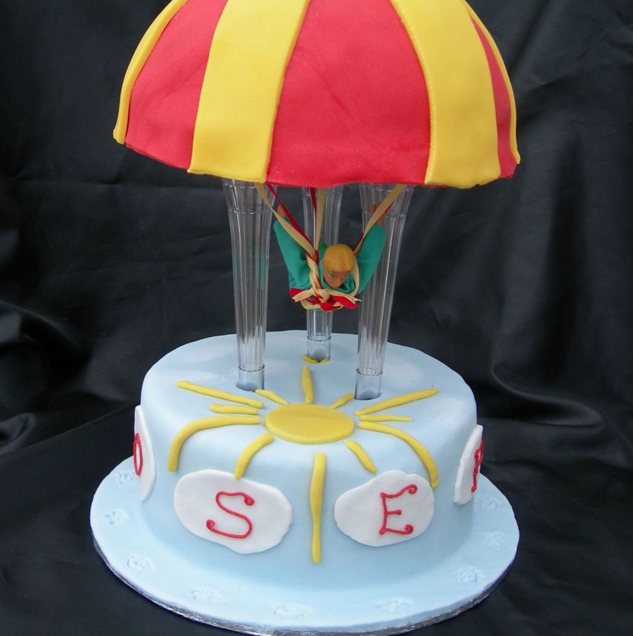 Thanks to Lueet for inspiring me! Parachute theme cake for a 3yr old boy. Round chocolate fudge cake for the "sky" and a choc sponge baked in half the sports ball pan for the chute.
