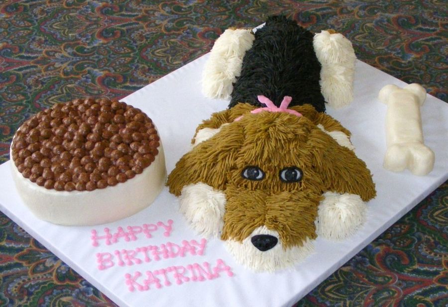 Thanks everyone! I used a yule log pan for the body, 1/2 of the Wilton Sports Ball pan for the head, then I carved away! Used the grass tip (233 I think) for the hair. Eyes, nose, bow (which you can't really see from this angle) and dog food are all BC. Bone is cake scraps covered in BC also.