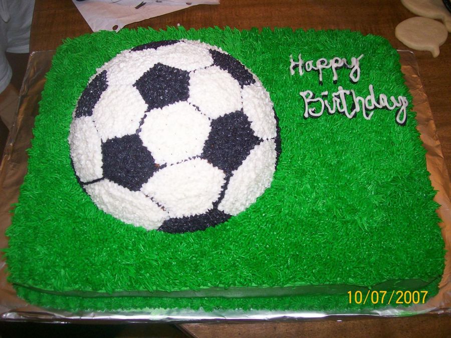 Soccer Ball on the "field" ..ball was white cake, sheet was darn good choc all with bc made with betty crocker dome pan and 11x 15