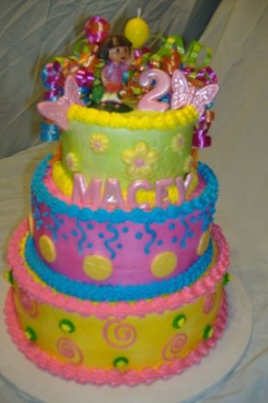 This little girl's mom got this cake idea off of CC a while back and E-mailed it to me .I changed the decorations up a little bit. The cake is iced in buttercream that I smoothed with a paper towel, and then sprayed with my air brush. I added the stars , flowers and her name which were made from mint molds. The Dora on top was a candle the mom bought.