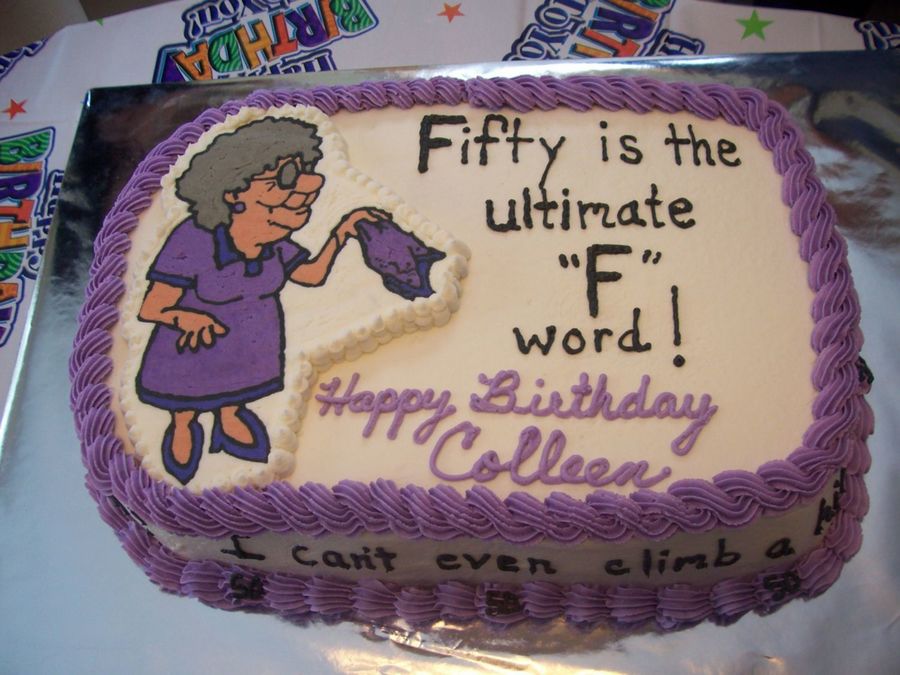 This was a birthday cake for my sister. Her favorite color is purple. On the sides of the cake I wrote..."Over the hill?....What hill?...I don't see any hill?...I can't even climb a hill...Oh you said How's Bill." (Bill is her husbands name) Needless to say she doesn't like that she has turned 50. Though she looks 35.