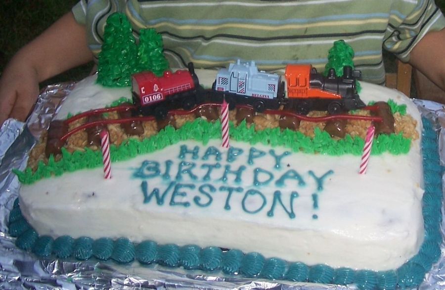 My son's 3rd birthday cake - ice cream cone trees, crushed candy and nuts under track, tootsie rolls for railroad ties, Buttercream grass, writing, and border