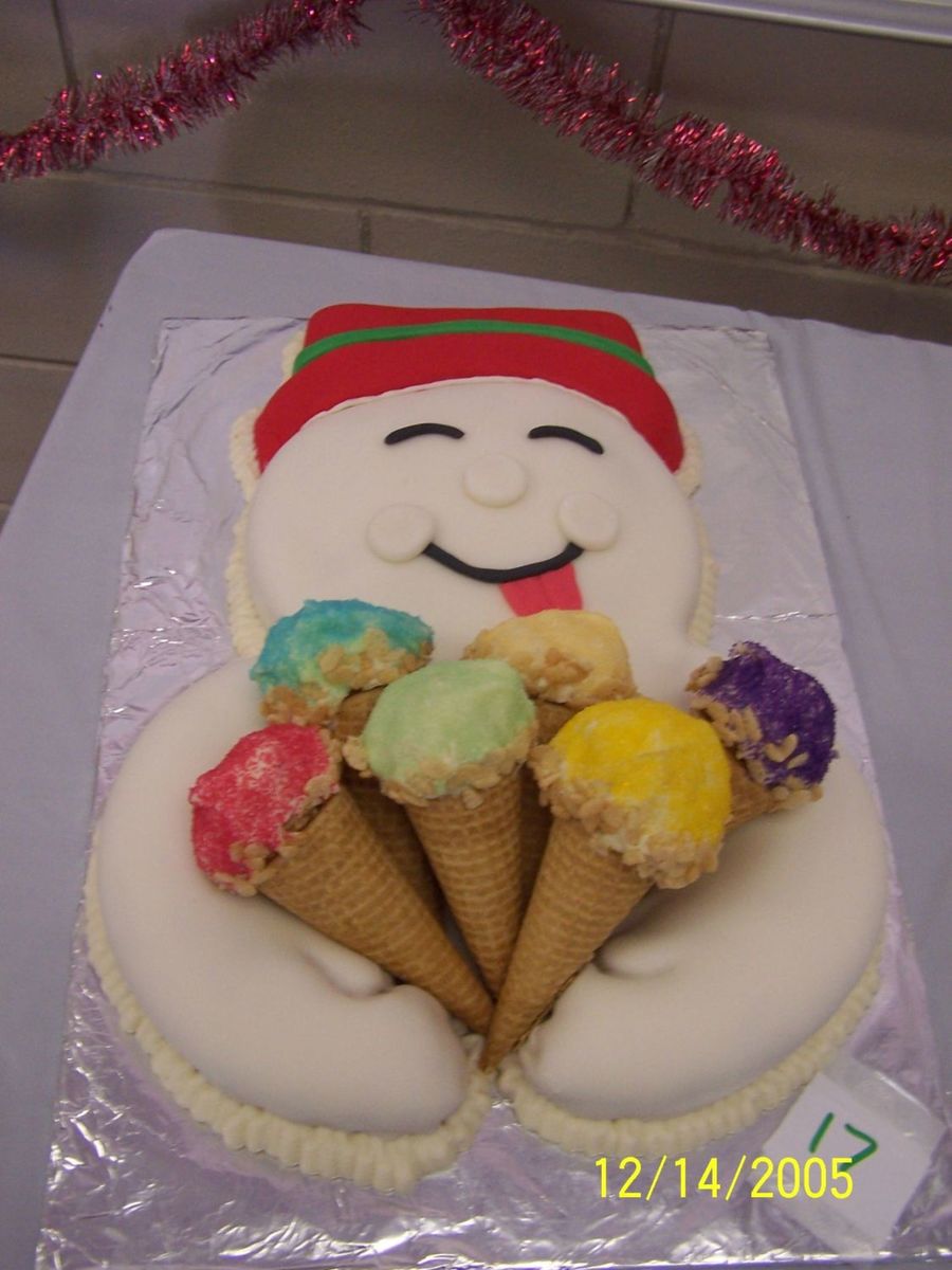 Taken from the pages of the Wilton 2007 Yearbook. I did not use the Wilton pan. Instead I used 2- 8" round pans and a 8" square and carved the arms , neck and hat myself. Everything else is pretty much just like the picture in the magazine, I think. I was SO proud!! It only won 2nd place in a contest at my Husband's work.....the other cake was mostly plastic.....not even close.....POLITICS!!! UUUGGGHH!!!!!