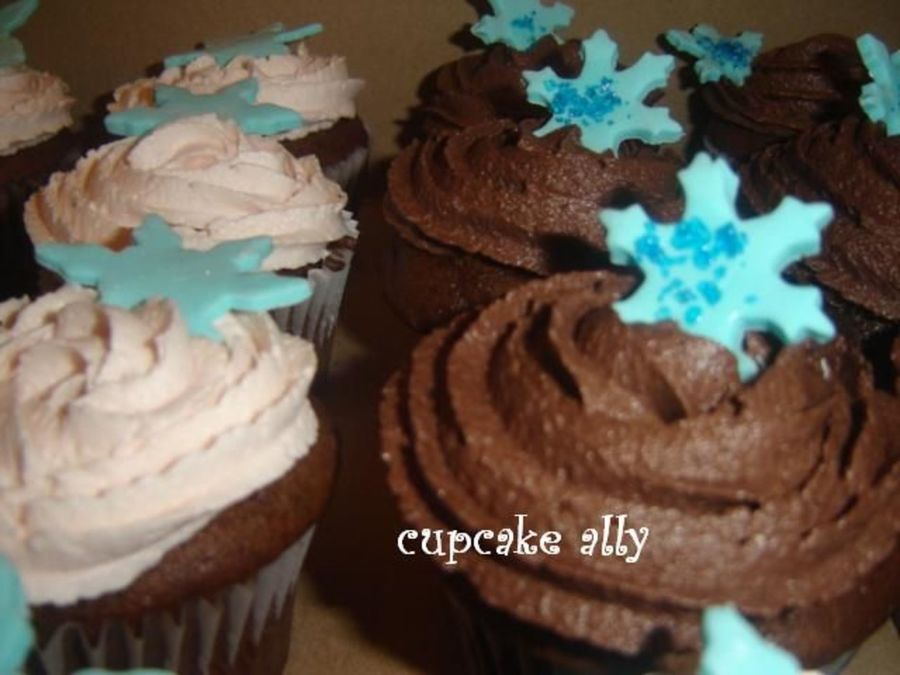 chocolate and vanilla cupcakes with dark chocolate and raspberry buttercream with fondant snowflakes.