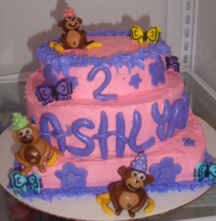 The monkey's are made of fondant, along with the flowers and banana's- the rest is buttercream. It was for a 2 year old little girl whose nickname is Monkey.