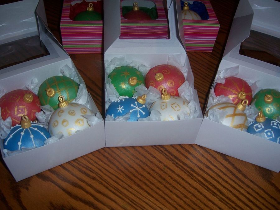 I made these for Christmas dinner and some to hand out for gifts... They are Red Velvet and Strawberry Cupcakes, with cream cheese icing and a hint of peppermint flavoring added...the tops and hooks are made with and covered in fondant icing, and painted with gold luster dust. Enjoy the pics and Merry Christmas,Mary :o)