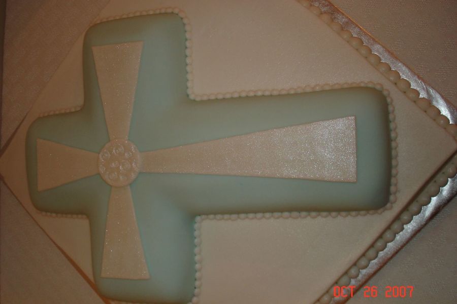 kiddocakes on 28 Apr 2008 , 9:53pm How crazy is that? I made a cake almost exactly the same for my son's baptism 2 weeks later! I mixed and matched ideas out of the Wilton book, but put my son's monogram in the middle instead! Awesome cake! haha :lol: