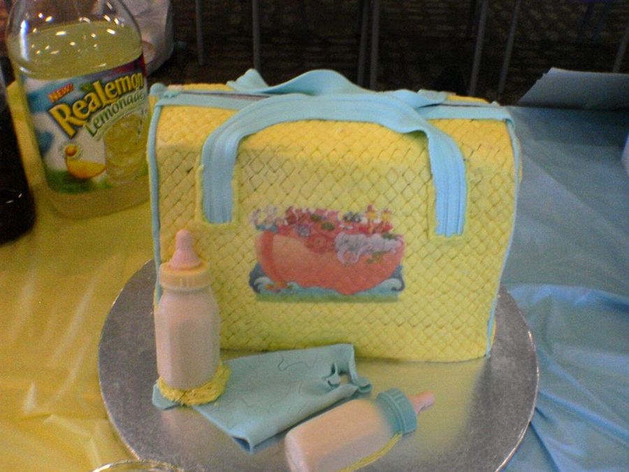 This cake was made for a baby shower it's 1/2 choc 1/2 white bc frosting and fondant, baby bottles made with white choc.