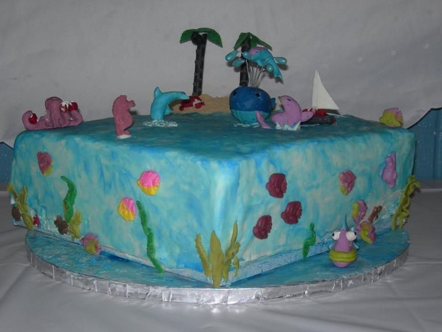 This was a representation of the Mother to be's family. The whale was her husband, the dolphin riding on the water on top of the whale was their young son, and the very pregnant dophin in the water was of course the mommy. Some of the sea creatures are bringing them gifts which they are putting in a boat beside them.