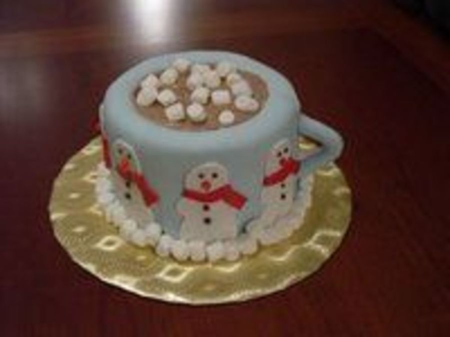 Here's my attempt at a mug of hot cocoa. It's a 2-layer 6-inch french vanilla iced in buttercream, then covered with mmf. The cocoa is chocolate buttercream with marshmallows, and the border is mini marshmallows.