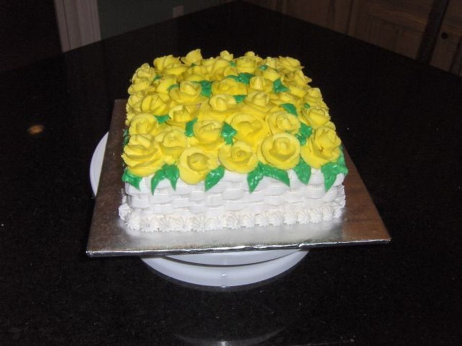 all btr crm. basket weave on side. Yellow roses with green leaves on top.