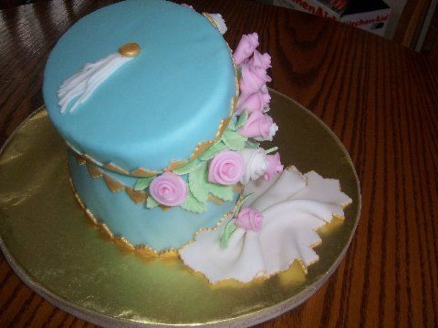 5 X 7 oval cake,Hershey chocolate cake with butter cream icing, covered in fondant,flowers,hanky,tassel,trim is all done in fondant and trim painted with gold luster dust, the lid is Styrofoam cut to shape and covered in fondant as well