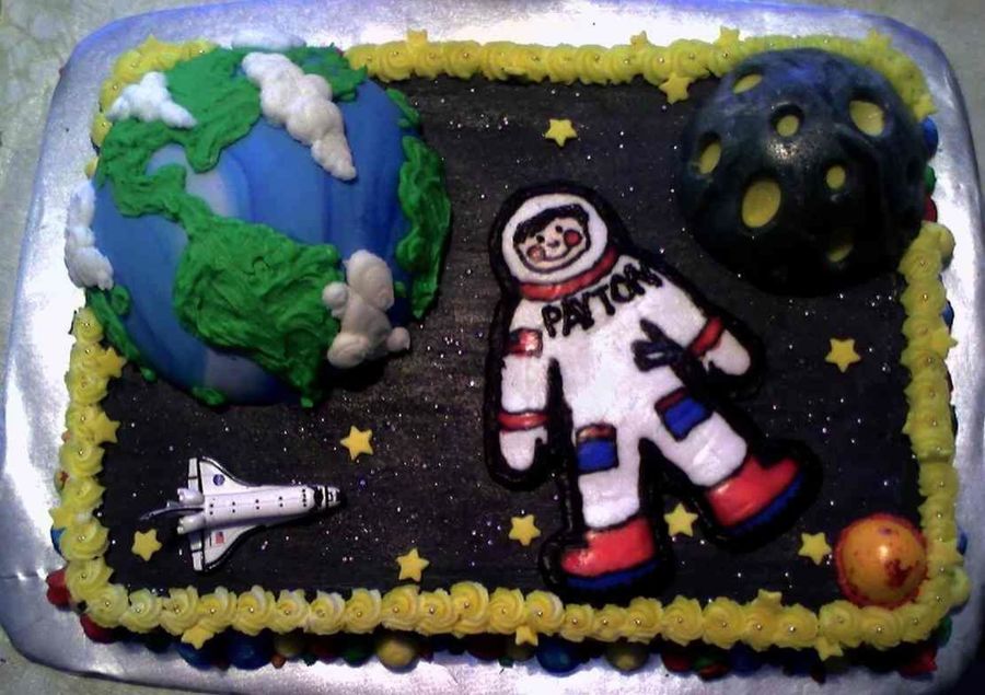 I made this cake for my 6 year old's party that was held at the planetarium. Astronaut is BCT. Earth I used a 1/2 ball pan, covered in white/blue swirled fondant, and land is green BC. Red planet is a large gum ball. Planets around base of cake are all buttercream. Moon is mini dome cake with fondant.