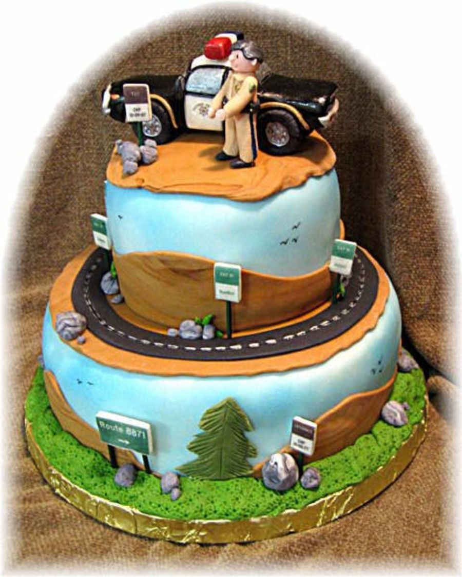 This is a torted, 10" double layer Devil's Food cake with Bavarian Cream Filling and a 6" torted, double layer Devils Food cake with Raspberry Cream Filling. All decorations are MMF (including vehicle) with the exception of the sign posts. Made for a CHP Retirement Party for a man that served 30 years. Thanks for looking!