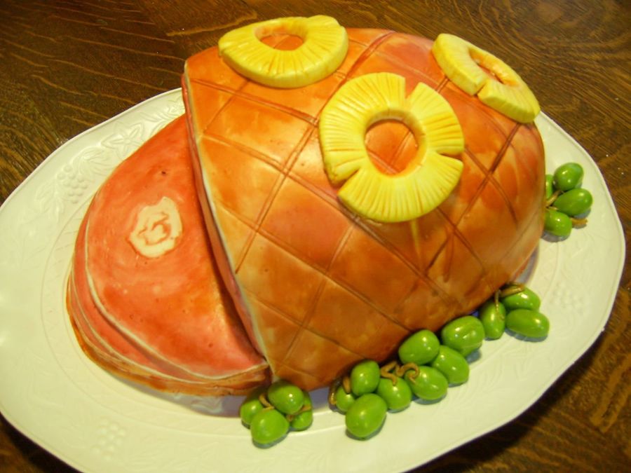 eatCakes on 6 Jan 2008 , 5:50am That's incredible! I've seen lots of turkeys but never a ham!! Great touch with the pineapple rings too!