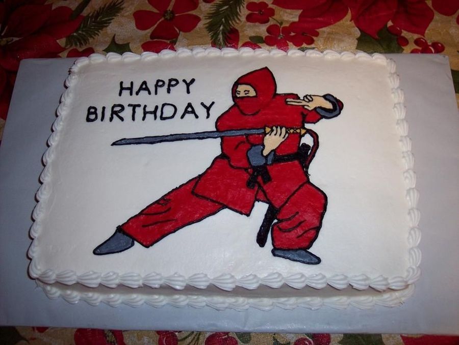 My nephew asked for a ninja cake for his birthday. I wasn't sure if I could do it or not (I am still really new to cake decorating). My boyfriend, sympathetic to my plight, drew a picture of a ninja for me and printed it off the computer in a pattern form. All I had to do was transfer it to the cake with butter cream!