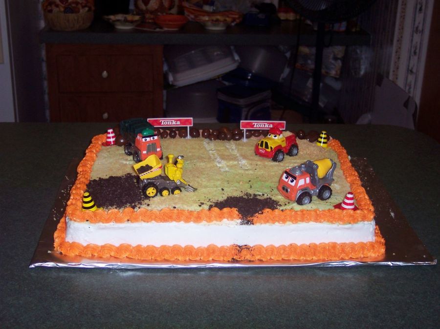 This is a cake I did for a 2 year old. I used brown sugar, crushed cookies, and crushed gram crakers for dirt. I used bridge mix for rocks. This cake was alot of fun and everyone loved it!