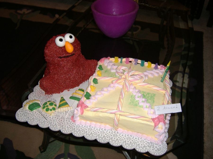 I made Elmo using the Wilton Bear Pan. He's covered in red BC using grass tip with fondant eyes and nose. Present is covered in BC with marshmallow rope candy, BC accents, and Candy Melt letters and lollipops that I made. This cake took a lot of hours! I'm not all that happy with the overall cake...