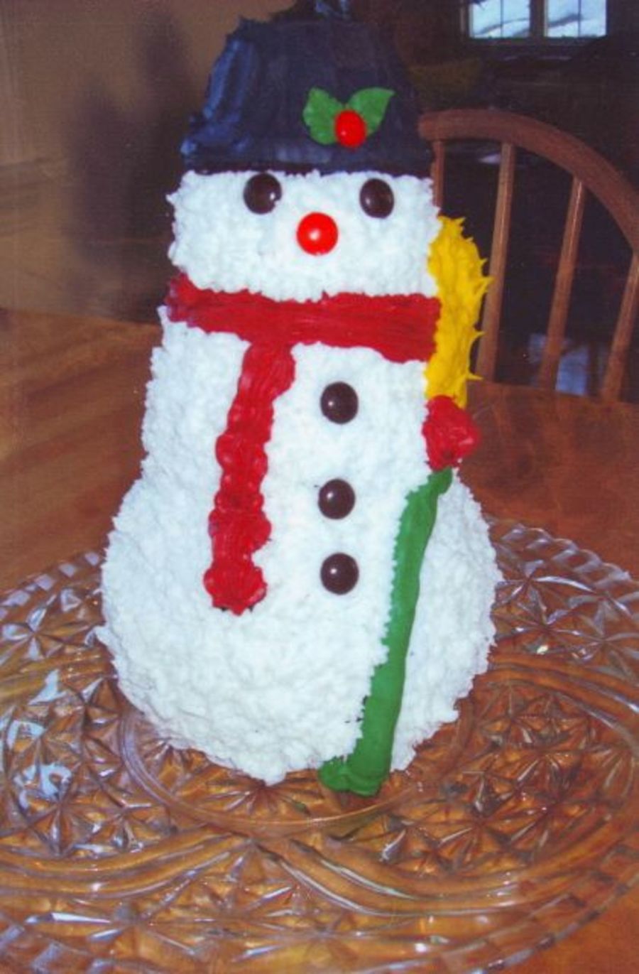 This cake was prepared with the Williams Sonoma Snowman cake pan by Nordicware. It is decorated with buttercream frosting and M&Ms for the eyes, nose and buttons.