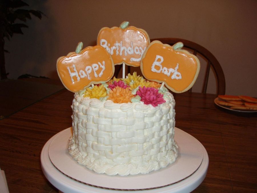 snowshoe1 on 2 Jan 2008 , 1:16pm Great looking cake and very creative with the pumpkin sugar cookies. Your piping skills are excellent - you mums and basketweave turned out great. Thank you for sharing.