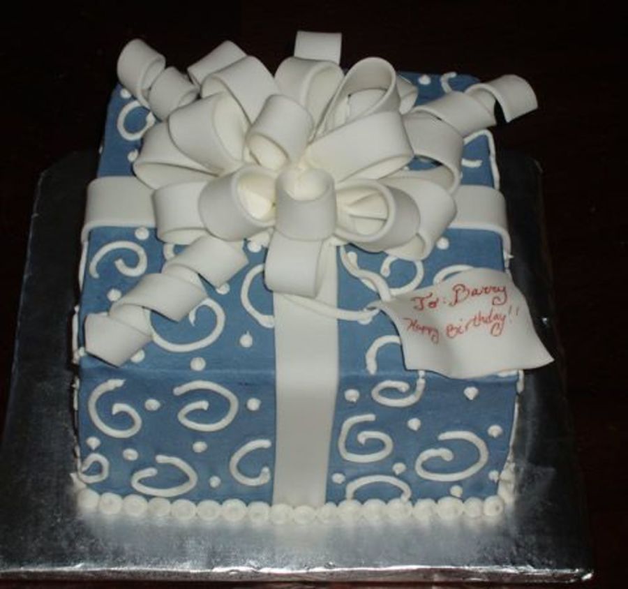 Blue gift box cake covered in buttercream with fondant ribbon and bow. (first fondant bow i've ever made). 3 layer 8 inch square cake.