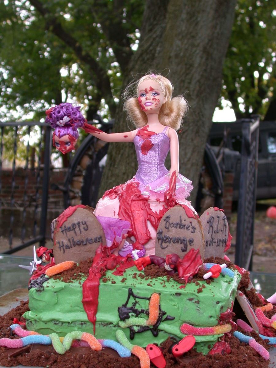 I saw the origional of this on cake central and almost died! It's a doll with a cake skirt in a grave yard. So of course I wanted to make my own. The origional I think idsholding a knife, mine has another doll's "bloody" head. A little demnted but everyone enjoyed it. I think the funnest part was breaking all of those breand new toys.