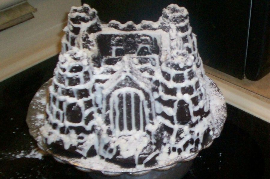 Using the Castle Bundt Pan. Chocolate cake. Used cookie writer for outlining the bricks. Then covered with snowflake sprinkles (hard to see the snowflake detail.) Then covered with powered sugar for more snow effect. My son loved it and it was yummy.