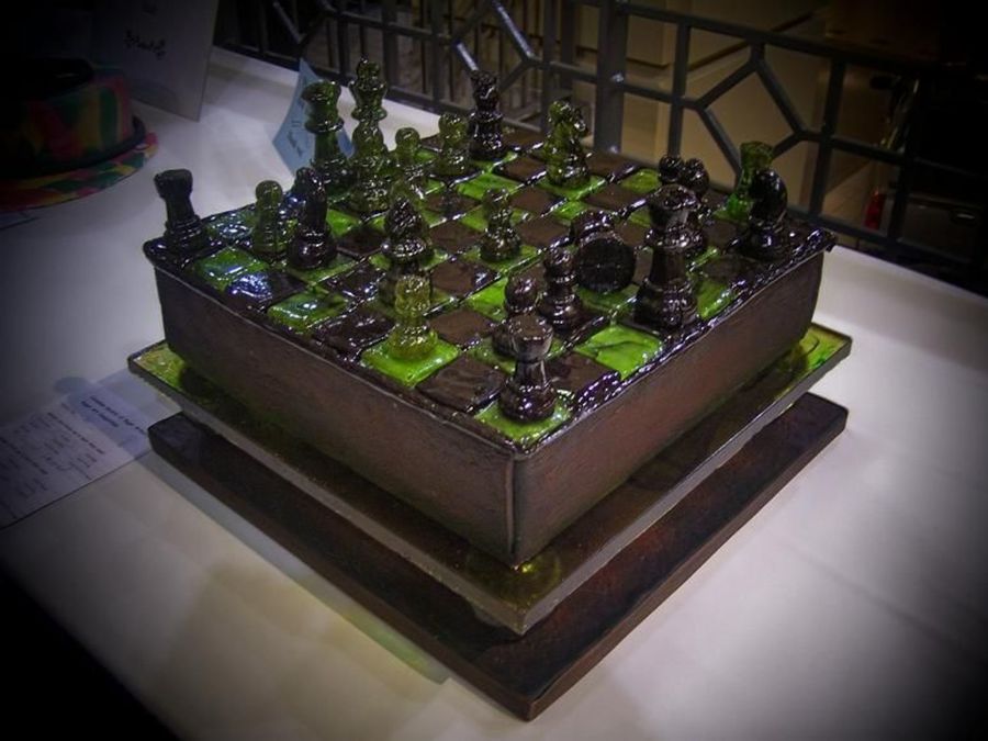 This was a chess set all made of sugar with fondant wood paneling down the sides. It is sitting on a marbled sugar table with 5 sugar balls to support it.