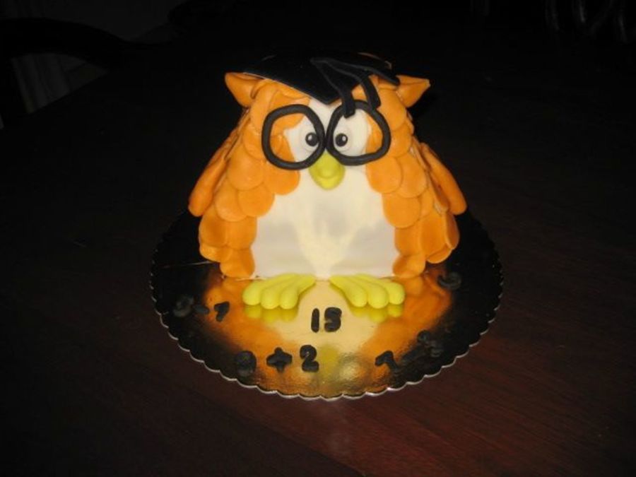 you make a round cake, mine was 20cm. Then you cut the sides at a little angle to make the sides. You cut 2.5cm off to make the base. Then cut two more wedges from the sides, to shape the owl. and then just crum coat, frost the cake and cover with tear drops of fondant.