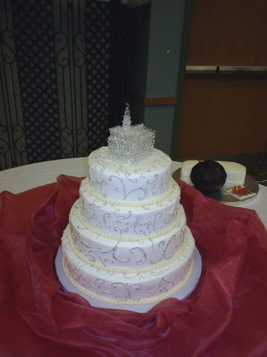 A friend of the family wanted me to do this cake after hearing about the cake I did for my SIL's reception. I was so excited and nervous to do an actual Wedding Cake!!! Everyone was pleased with the outcome and I'd love to do another. 14", 12", 10" and 8". 2 layers of choc w/ whipped ganache and 2 layers of white w/ bc. Scrolls are painted with silver luster dust.