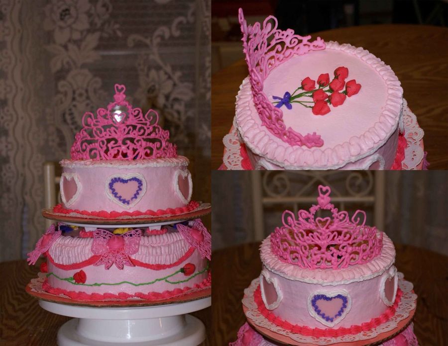 My grandson's teacher gave me 12 hrs notice to do a "girlie" cake for her 28yo daughter. She wanted everything pink. I started with a strawberry cake and worked up from there. The tiara and bows were done in pink RI the rosebuds were BC. It's a little hard to see but I also put pansies on top of the bottom layer. She didn't want it too tall so I just used dowels and plates without columns. Enjoy, they did.