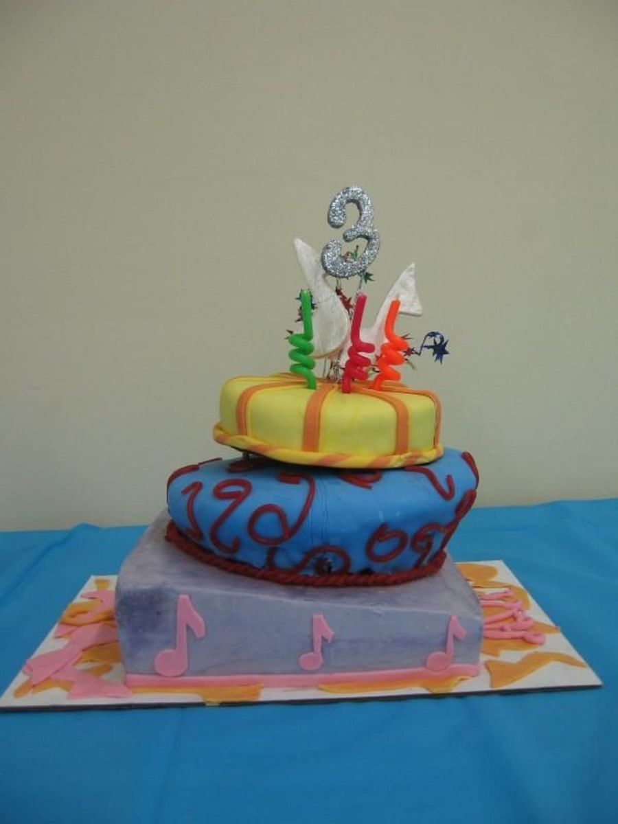 Inspired by the other Doodlebops cakes on here. For my DD's 3rd b-day. First 'real' fondant cake, first topsy turvey, first IMBC... overall happy with how it turned out and a lot of fun to make. Chocolate cake with peanut butter filling, white cake with cookies and cream filling... YUM!