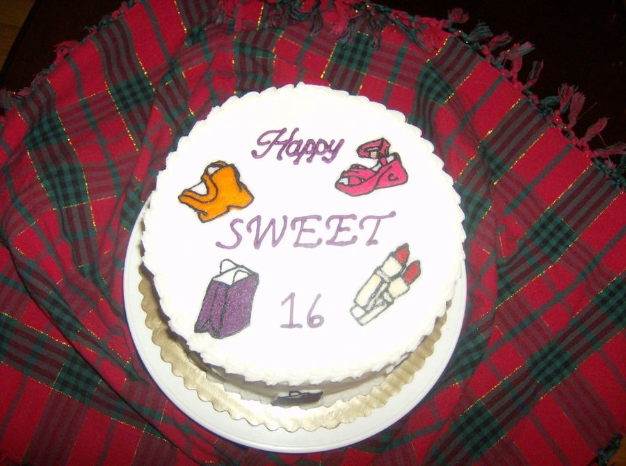 Cake has BC transferrs of shopping bags, shoes, lipstick, nail polish, jeans, shirt and purse