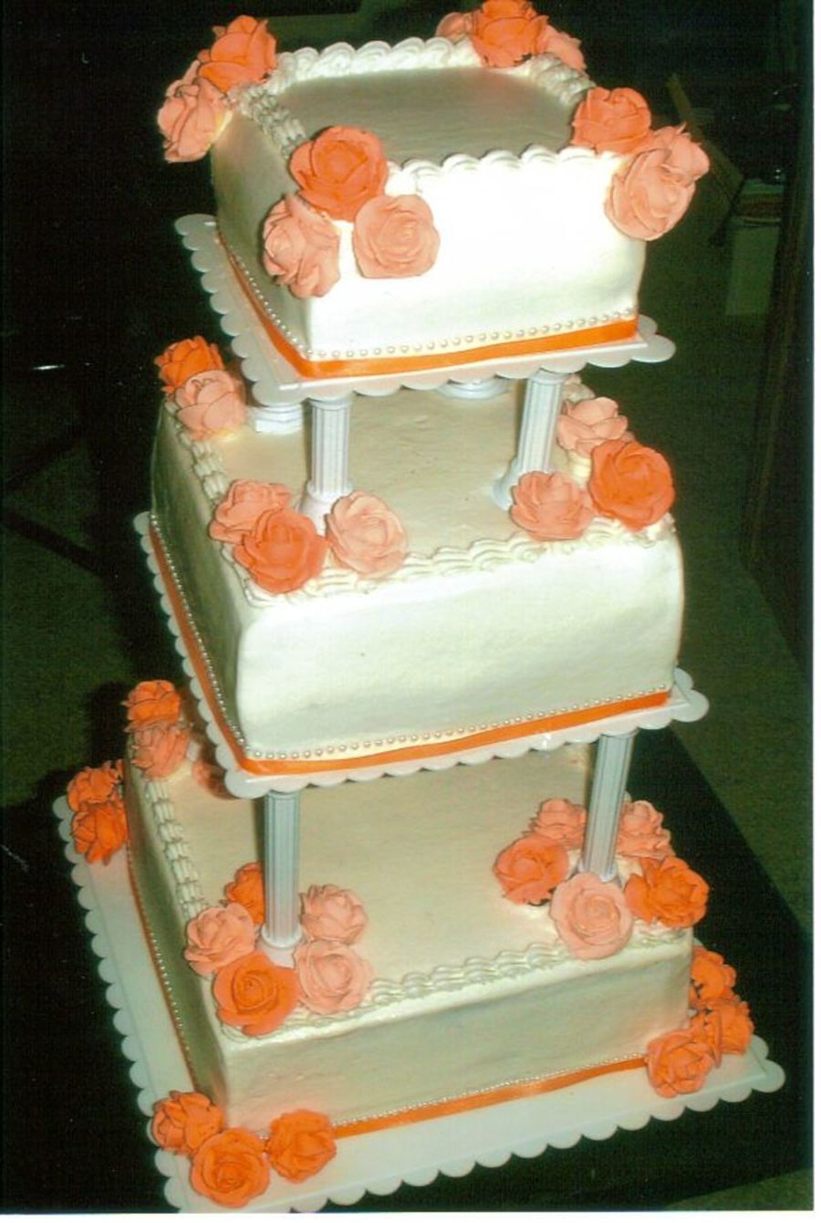 THIS CAKE IS WHAT THE PERSON WANTED, COLOR, ETC. PEACH IS JUST NOT MY FAVORITE COLORS, ROYAL ICING ROSES, RIBBON AROUND BASE, AND B.C. BRIDE AND GROOM LOVED IT!
