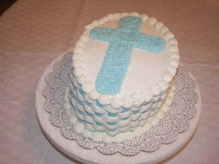 Chocolate WASC, Chocolate Syrup filling, Buttercream basketweave. The Cross is buttercream (and off center, I know. I was doing it quickly. My grandsons Christening combined with Grandaughteres birthday. There wasn't a drop left!!