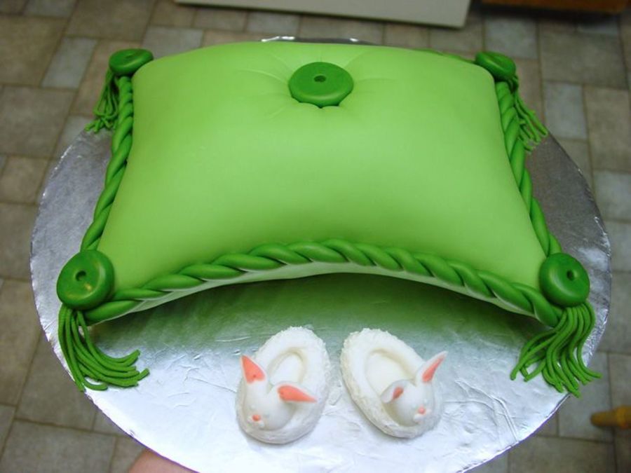 Cake is covered in fondant with fondant decorations. Bunny slippers are gum paste.