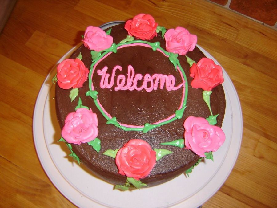 This is my first time doing roses (I've never taken a class or anything) and I guess they turned out alright. I notice now that my circle around the welcome is really off center! The cake is WASC with chocolate cream cheese filling and iced with chocolate buttercream. I made this for our new neighbors who moved in across the street. I got inspiration from a few cakes that I saw here on CC.