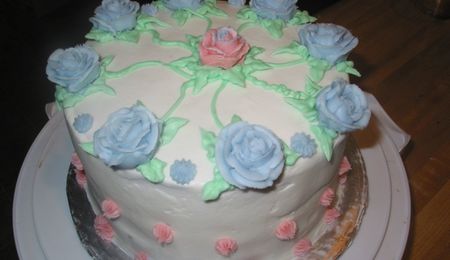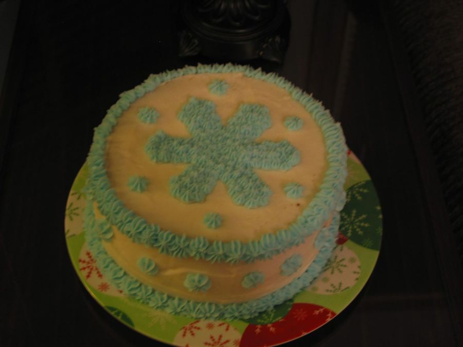 This cake is a blackberry jam cake with vanilla filling and buttercream frosting.