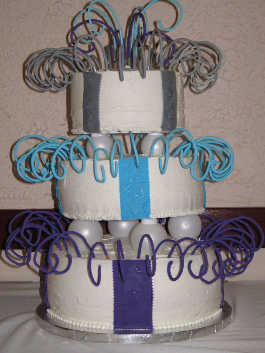 I made this cake for a friends daughters 16th birthday party. She wanted a cake that looked modern and had a fun look. I made all of the curls out of royal icing.