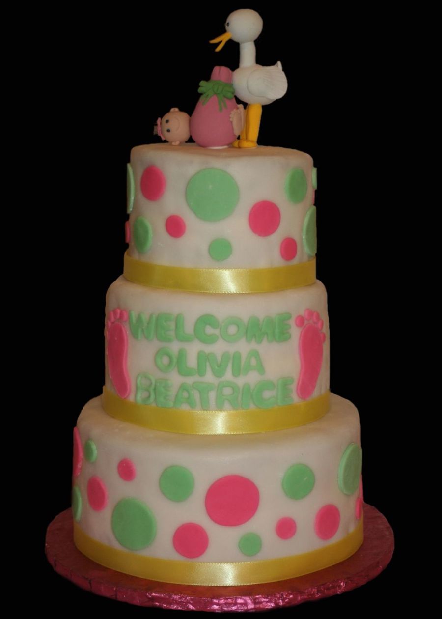 Carrot cake covered with fondant & fondant decorations. Baby & stork topper make out of sculpy clay. The mommy-to-be wanted to keep the topper so I made it out of clay.