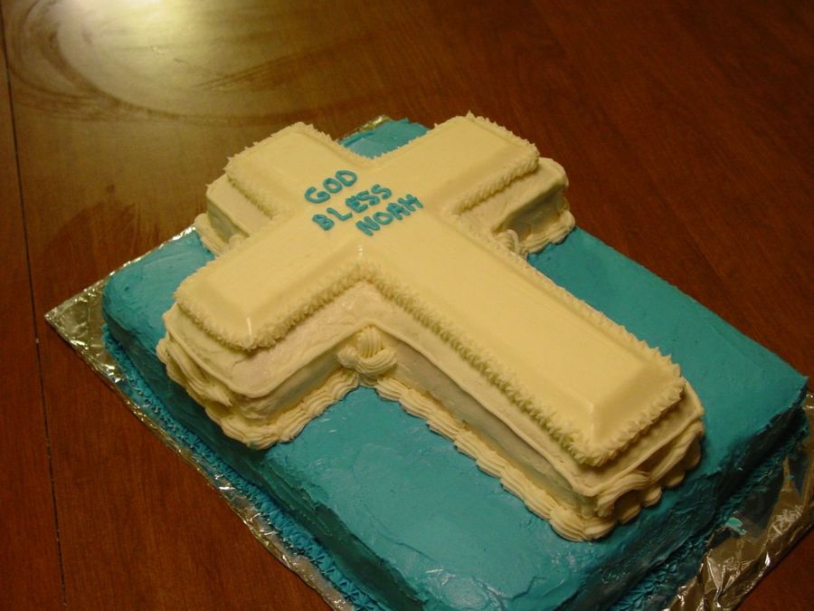 Cake was 11 x 15 Choc. cake with buttercream icing, and cross was vanilla cake with white buttercream. (customer only wanted BC, no fondant). Cross ontop was melted white chocolate, which turned out very nice and easy!