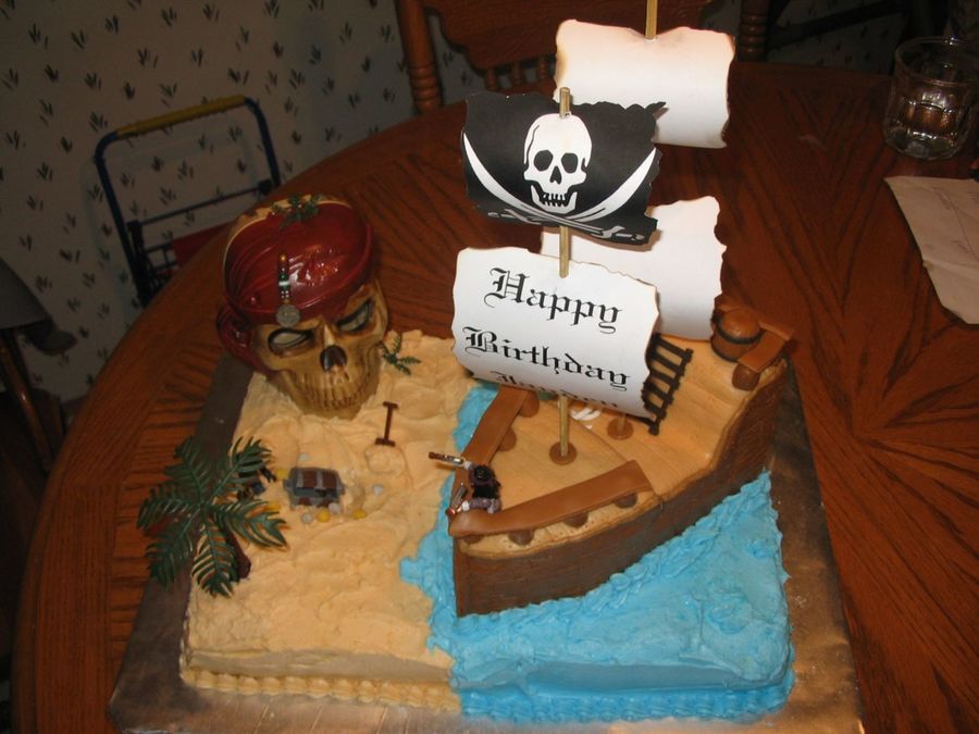 the ship is shaped out of a sheet cake covered in fondant, the skull is a toy.