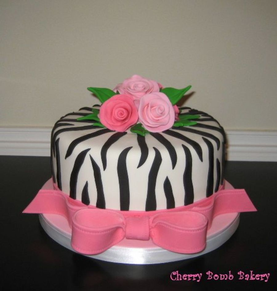 I finally got the chance to use a zebra pattern! I was inspired by a lot of the cakes here on CC. I couldn't make a decent looking ribbon rose to save my life so came up with my own method. Basically, I just hand flatten and thinned balls of fondant. It was very simply.