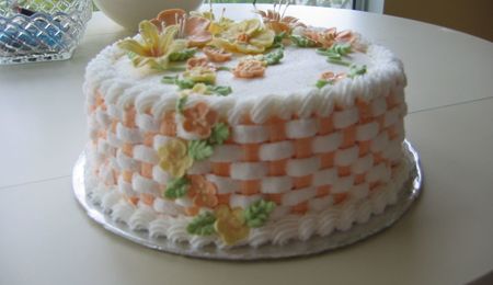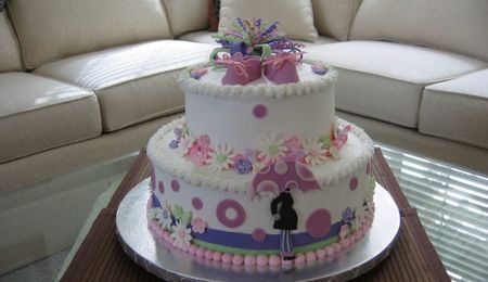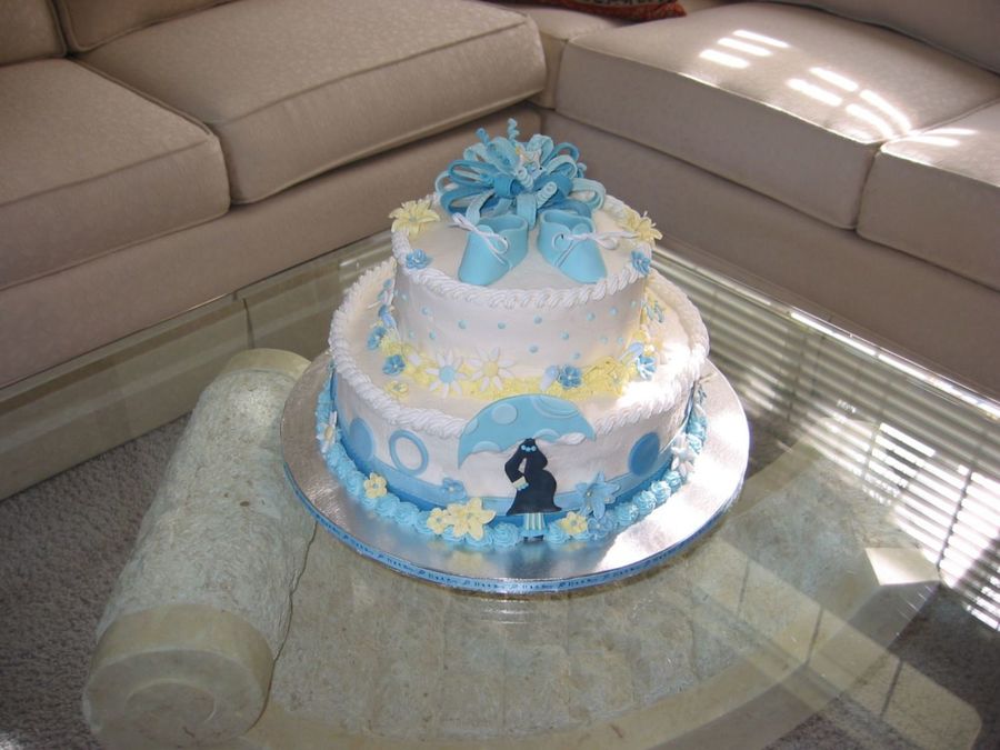 Buttercream frosting with royal icing flowers. Fondant bow and booties.