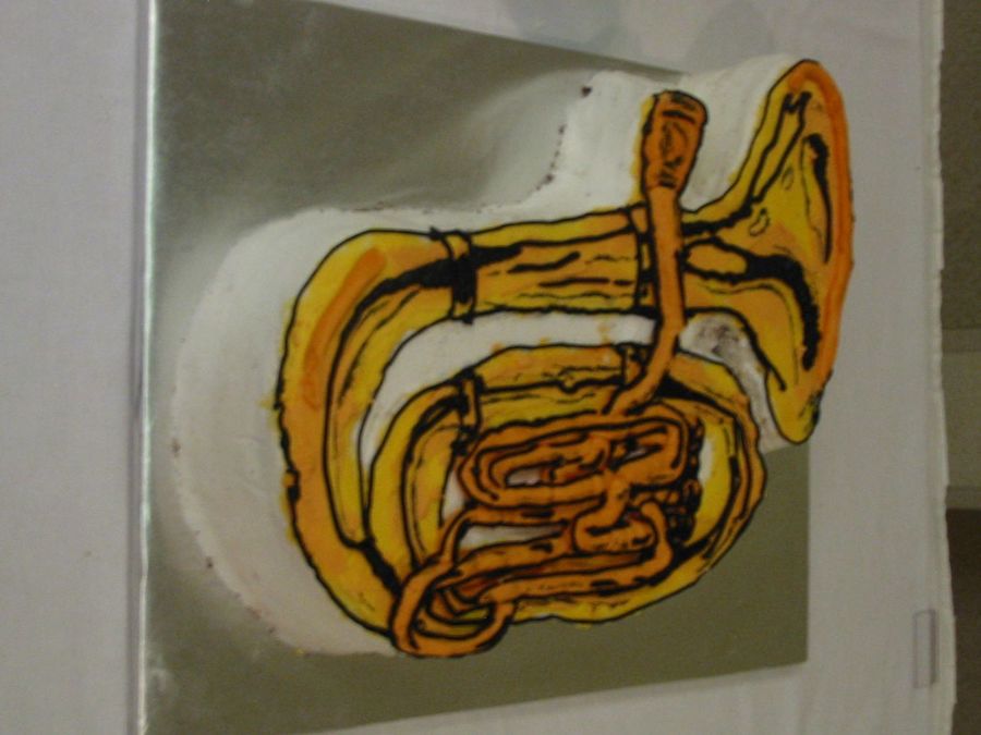I hope euphonium is how you spell it! The bride and groom are both music teachers and this is his instrument of choice. The carving was fun. To get the color effect I had to let it crust frequently and do several layers of color. The final black "gleam" is done with edible Wilton black marker. Way fun.