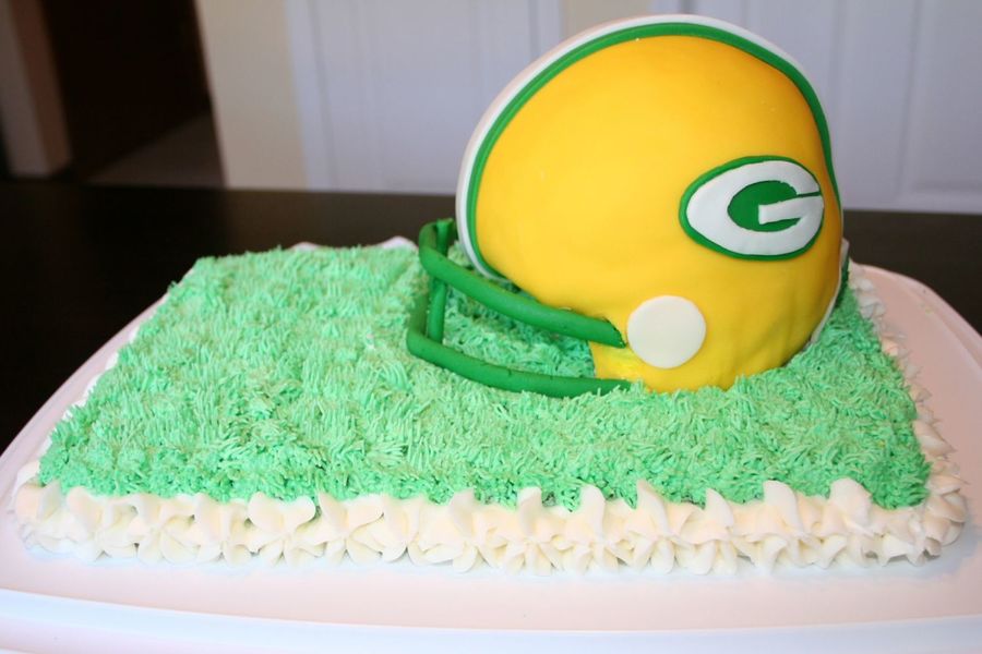 This was my first "real" cake. The helmet is vanilla cake covered with fondant. The face mask is also fondant (but broke while assembling the cake). The field is chocolate cake covered with buttercream.
