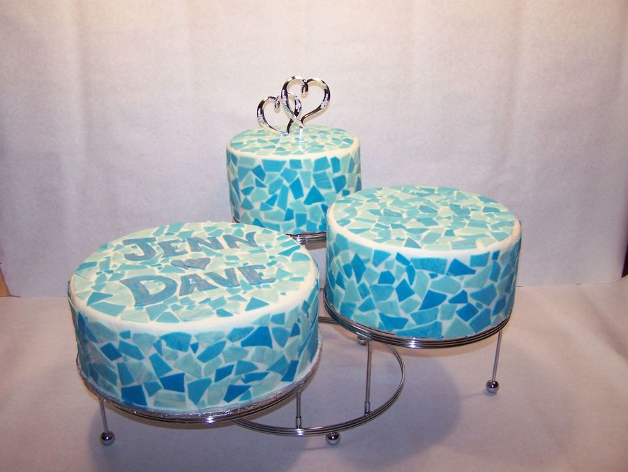 This was an engagement party cake. The bride to be's hobby was making mosaic pieces. The blue "tiles" are chocolate.