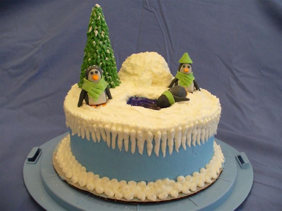 8" round two-layer with buttercream icing. Penguins are made out of gumpaste. Tree is ice cream cone with green icing piped on with leaf tip. I sprinkled a little powdered sugar on the tree and the white part of the cake. Thanks to dabear and Arty for inspiration from their penguin cakes!