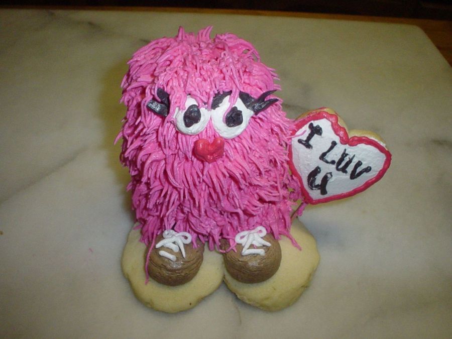 Made from 2 cupcakes stacked on top of each other, covered with #233 buttercream strings. Base is a heart cookie and the sign is a smaller heart cookie.