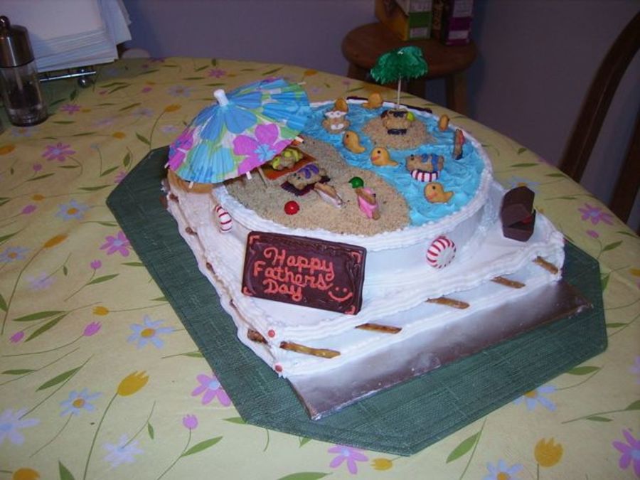 back view of fathers day cake {cant find the front view?} this was fun to make. i made each teddy gram like a member of the family. grounded pecan sandies for the sand. teddy grams decorated with writing fondant.